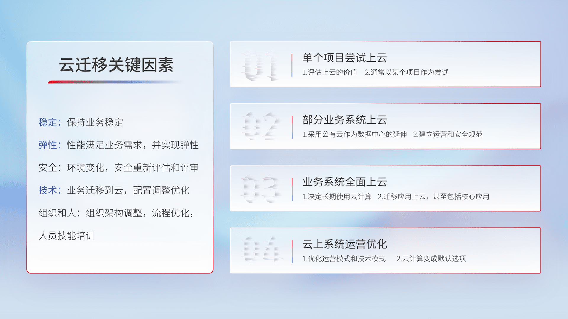 结合实际业务,,,从规划设计、、、云平台选型、、、、云原生改造、、、数据迁移、、集成交付,,迁移全过程为客户识别最佳上云路径,,,做好风险识别管理,,,设计网络架构、、、、身份权限、、安全审计合规、、操作审计、、日志审计、、、监控告警策略、、多站点容灾设计等,,,对云上基础设施进行整体规划,,提升IT治理水平,,以满足弹性、、高可用、、、高性能的需求。。。。